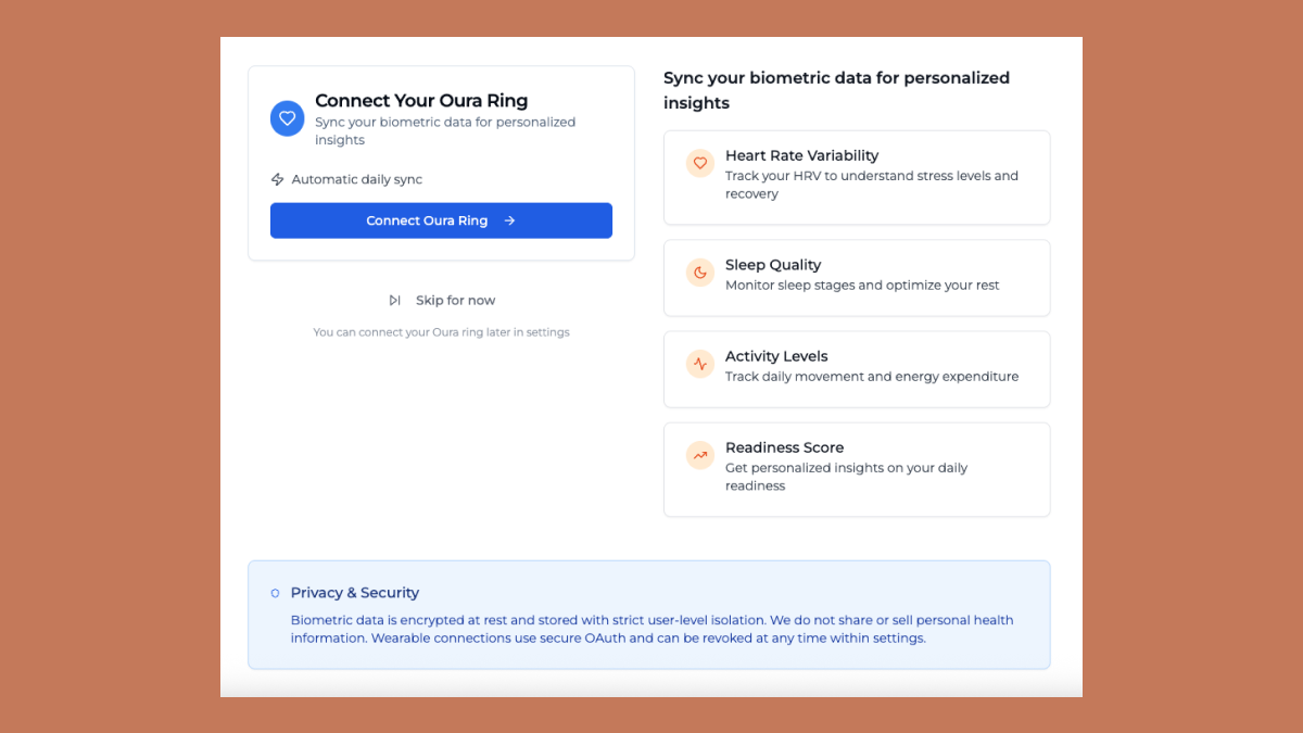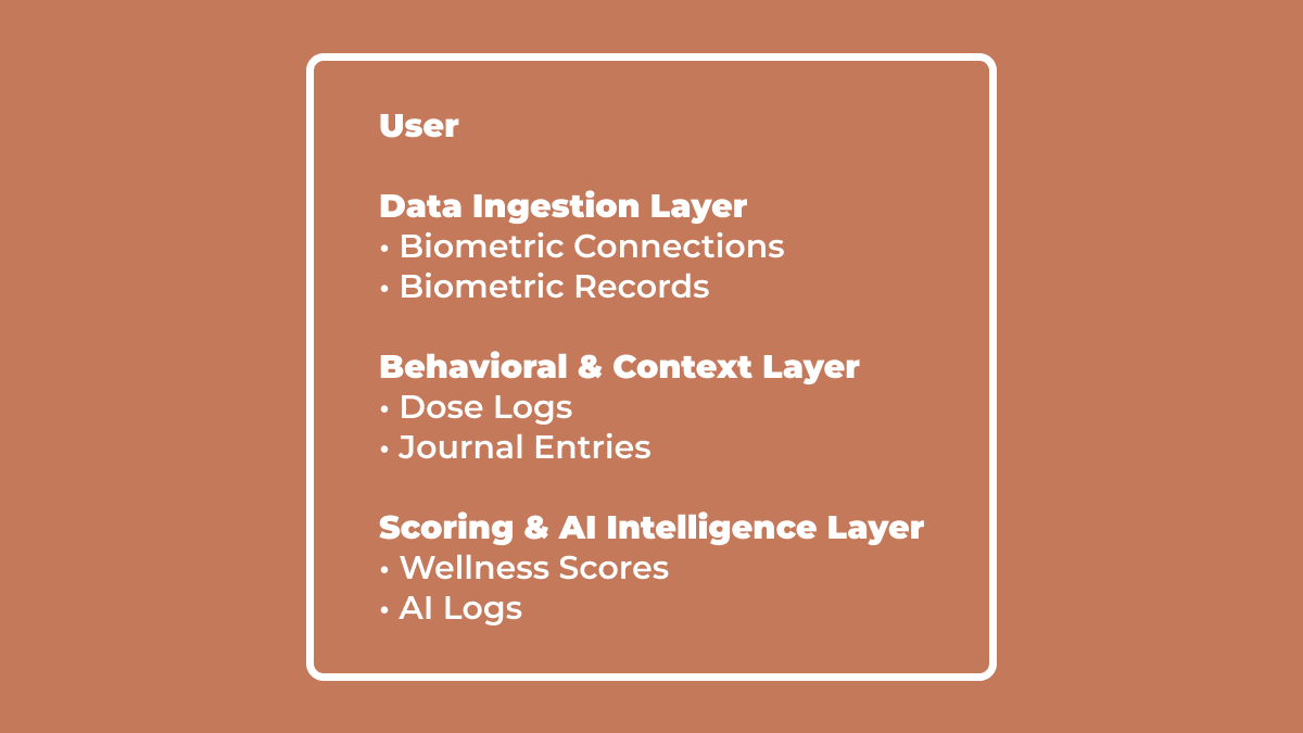 The opportunity was to design a privacy-first AI platform that could securely ingest Oura Ring biometrics, structured dose logs, journal entries, and survey responses -- translating multi-dimensional inputs into responsible, non-medical insights.