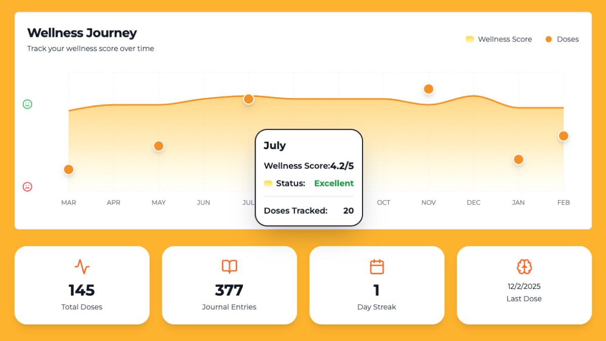 Longitudinal wellness scoring dashboard correlating biometric signals, structured dose tracking, and reflective journal inputs to surface context-aware, non-medical insights over time.